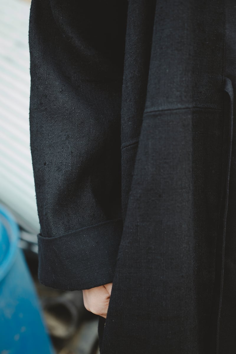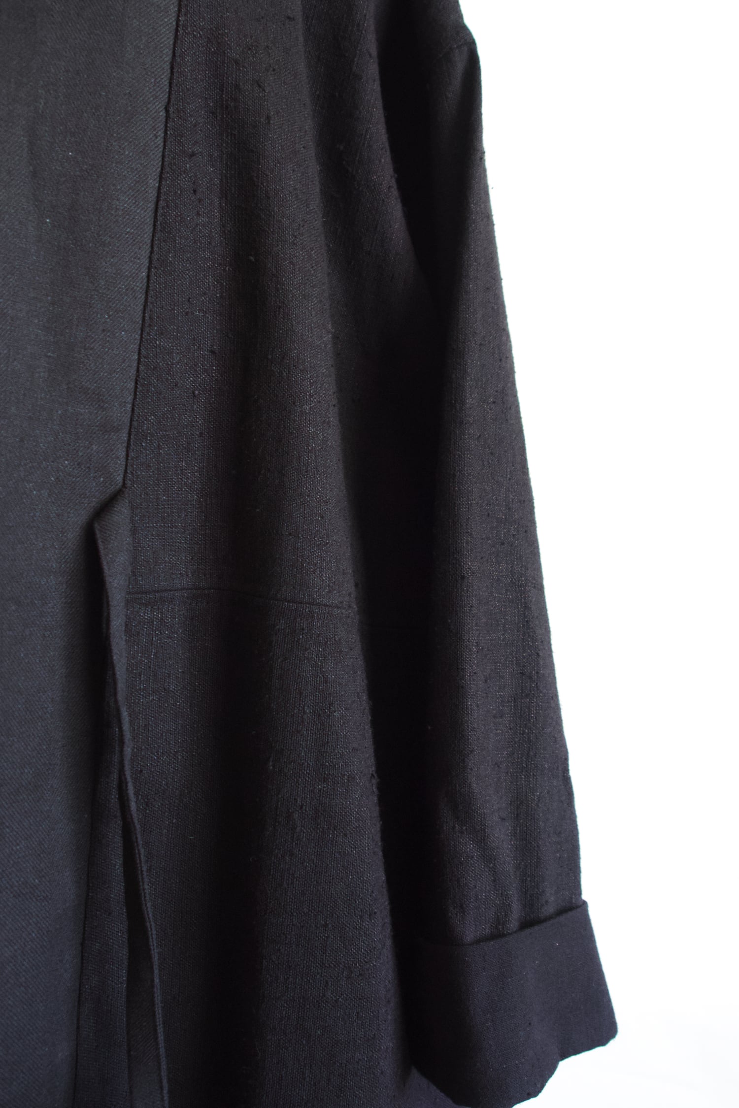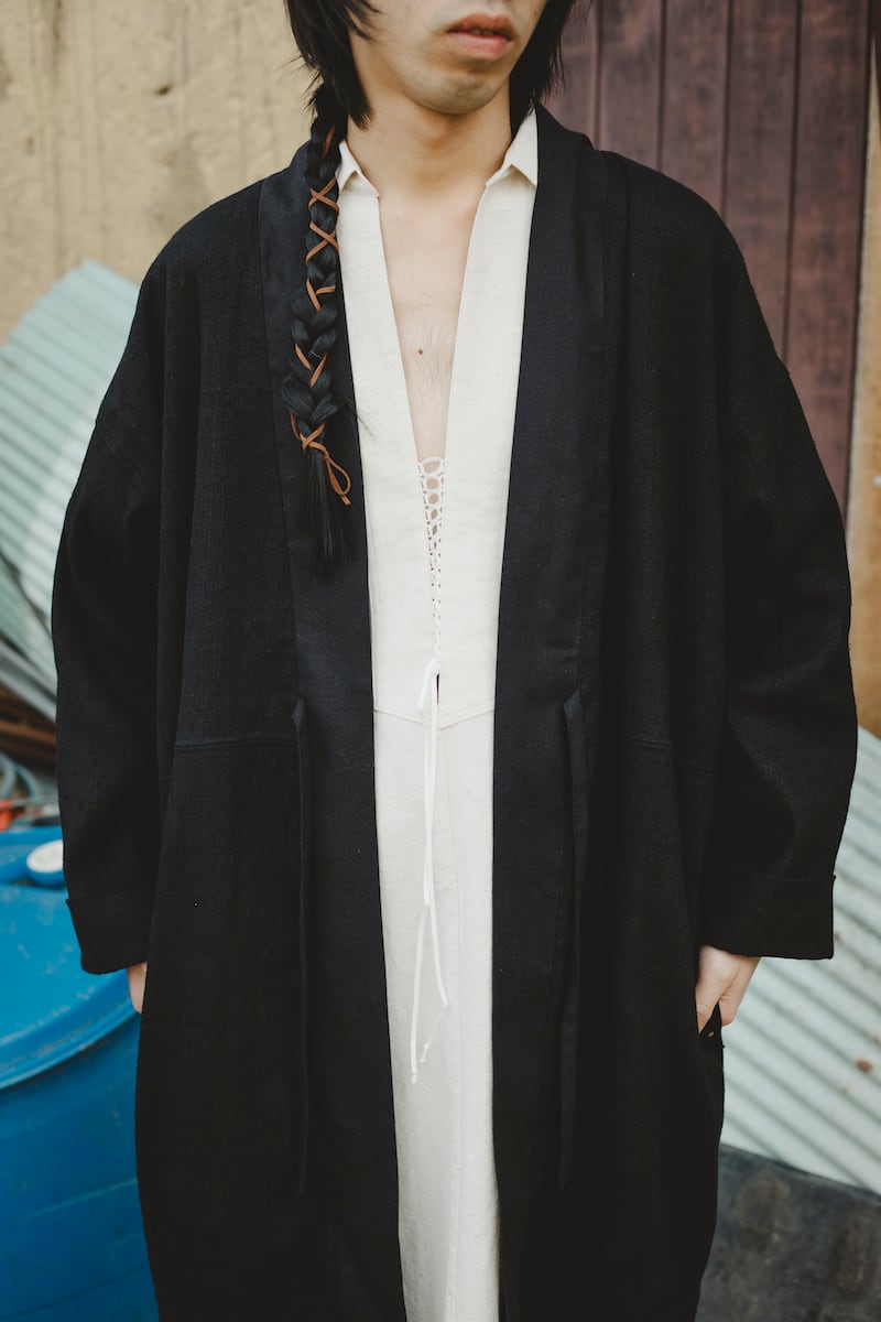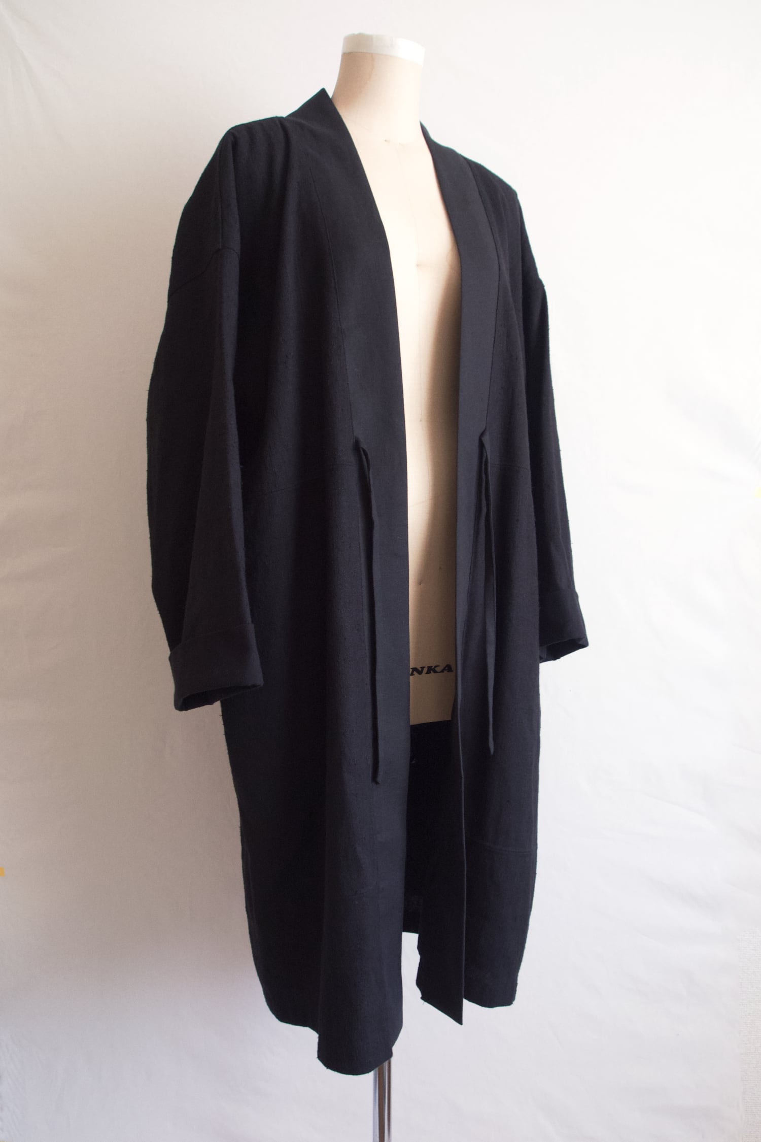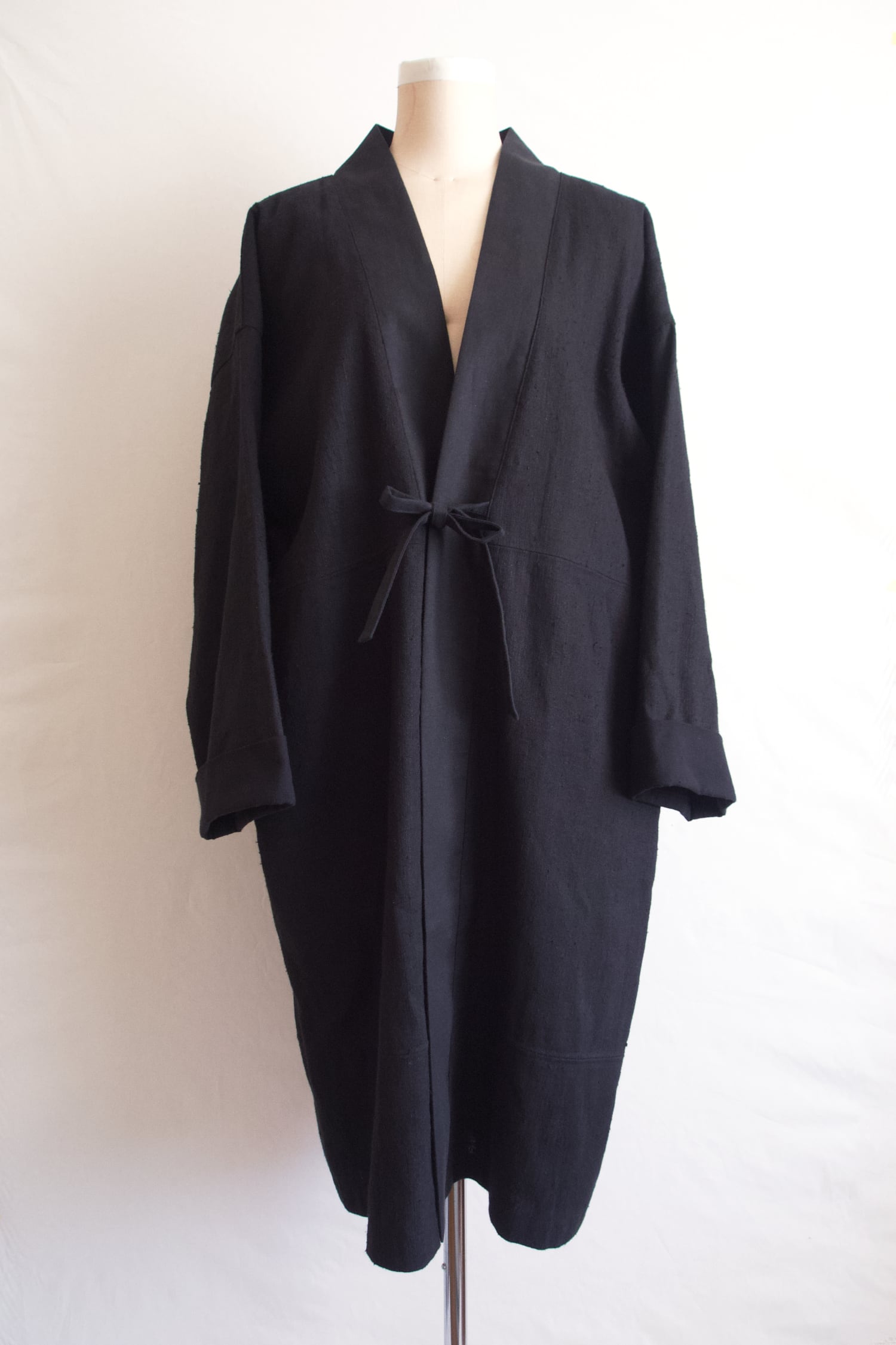ルーマニアで90年ほど前に手織りされた布を使用した、ユニセックスサイズのロングガウンコート。現地で買い付けた後に国内で黒染めを行い、見頃に裏地を付け、現代の日常着として取り入れやすいアイテムに仕上げました。