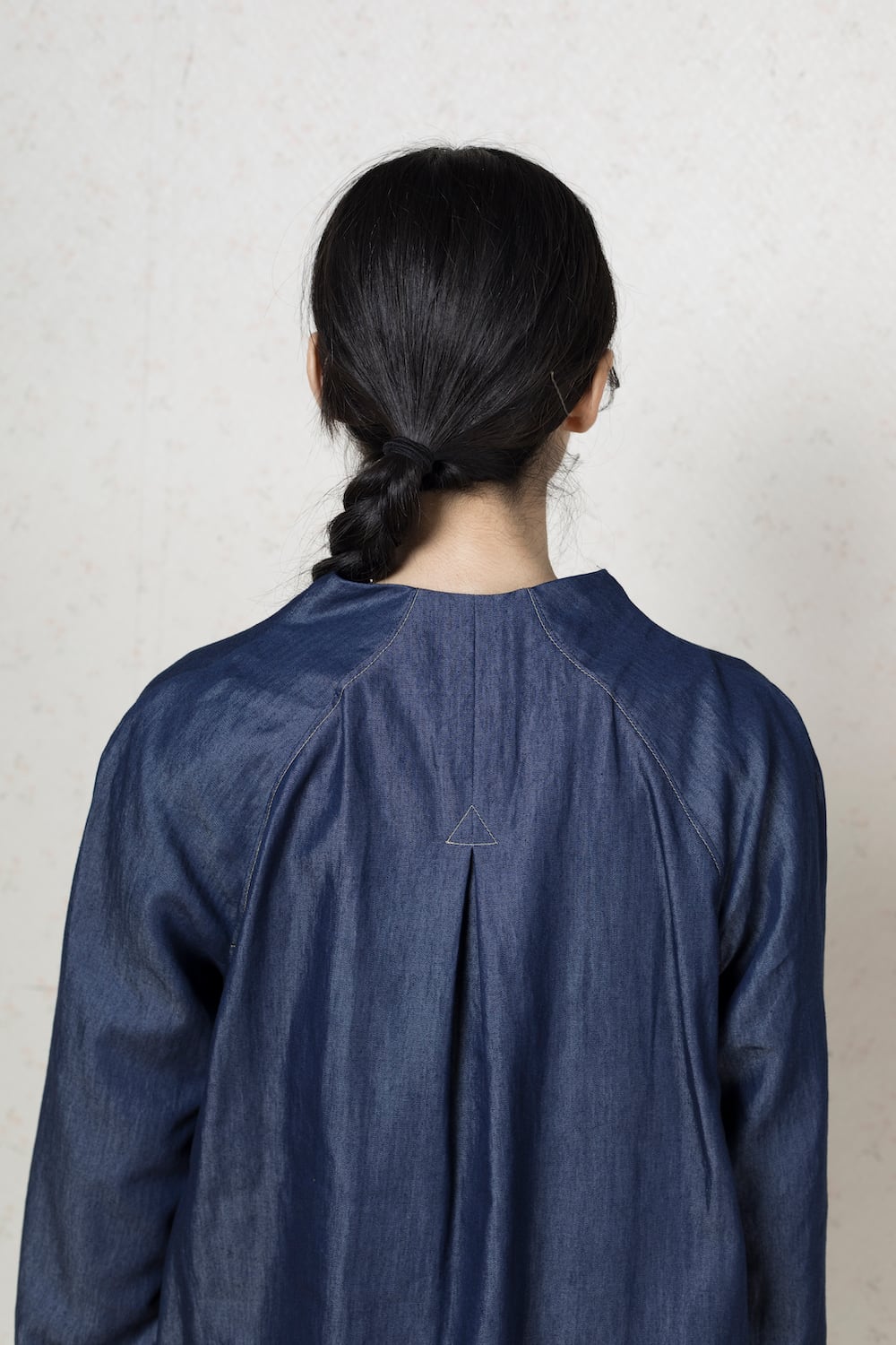 スタンドカラーにせまく深いVネックを合わせ凛々しさを出しつつ、なめらかにつながるラグランスリーブのシルエットや両サイドのスリットに、女性らしいカーブや身のこなしを感じられるデザインにしました。少し長めの袖はひとつ折り返して着ることもできます。