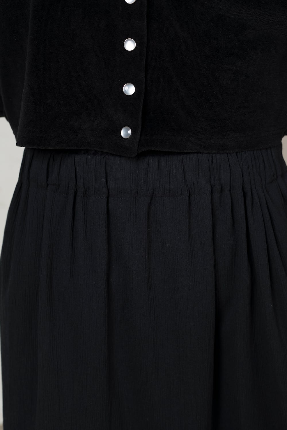 裾の切替からたっぷりとギャザーを入れたマキシロング丈スカート。上部は細身で、切り替えより下はボリュームのあるメリハリのあるシルエットが特徴的。大人の雰囲気を残しながら甘さを感じられます。